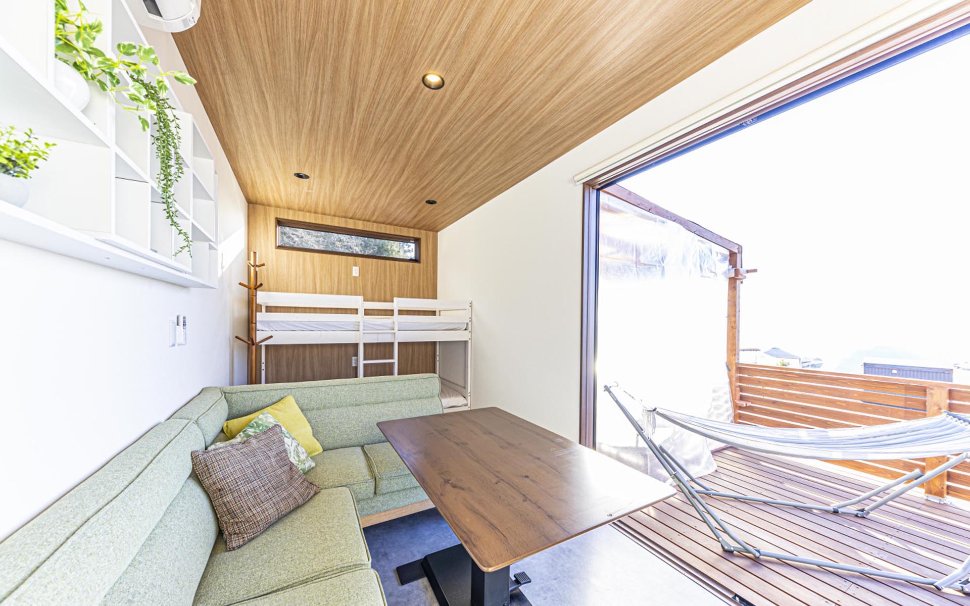 「フランクなキャンプ=フランピング」をテーマとした客室は、広々とした室内に冷暖房完備、専用のキッチン、シャワールーム、ベッドルームとまさにホテルライクな快適空間が広がります。